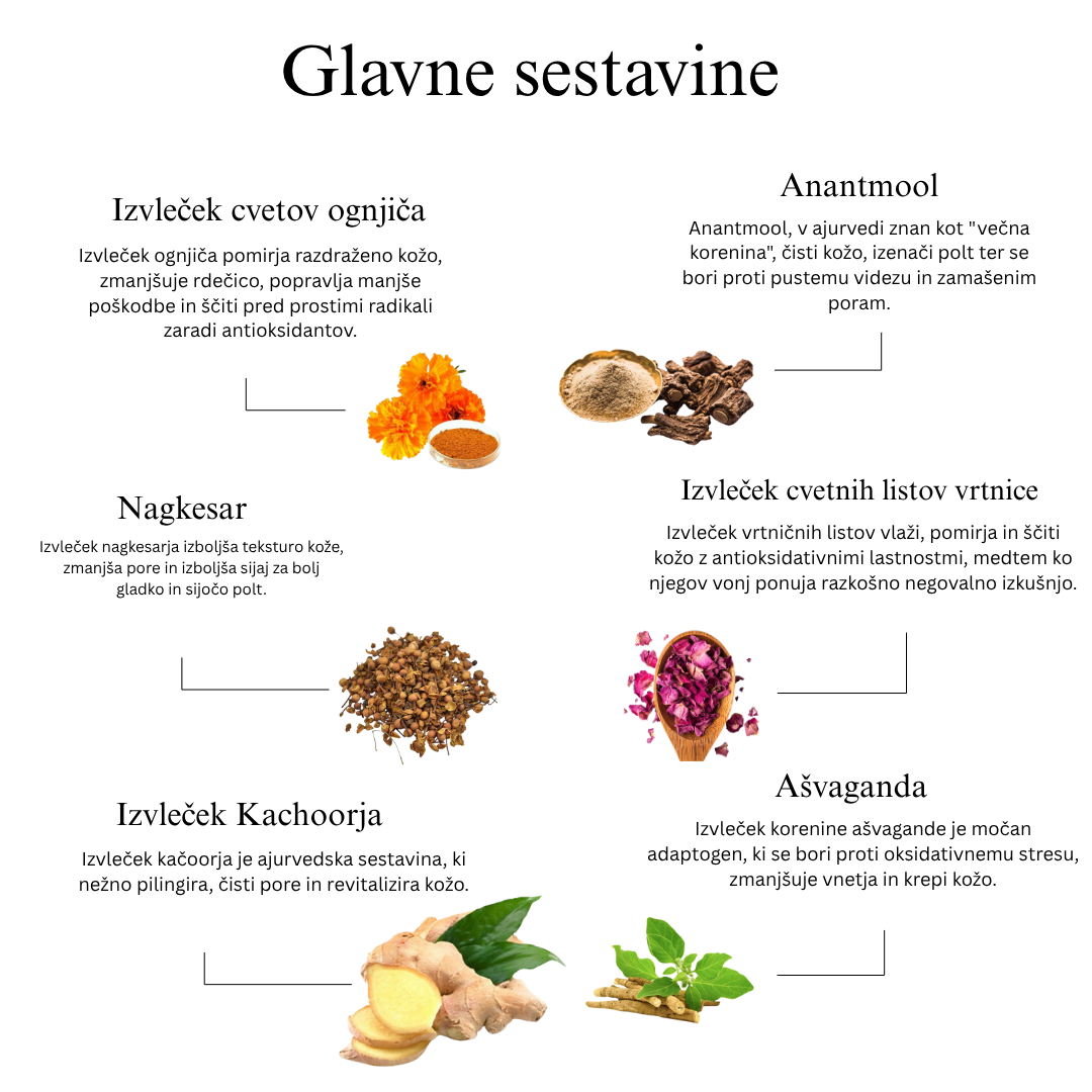 Čistilo za obraz je nežno, a učinkovito ajurvedsko čistilo, zasnovano s skrbno izbrano mešanico preizkušenih rastlinskih sestavin, ki kožo očistijo, razstrupljajo in pomladijo.