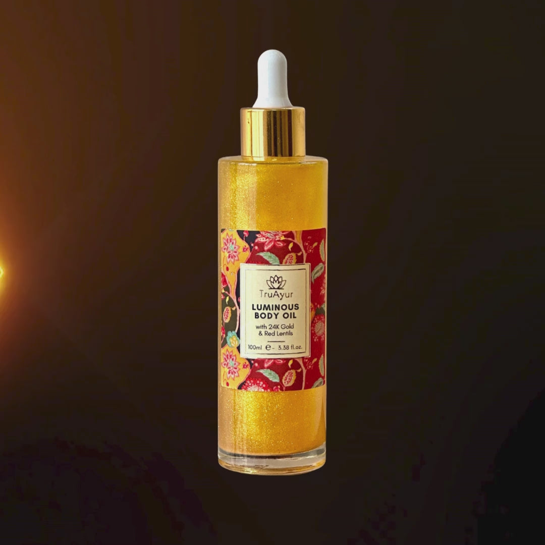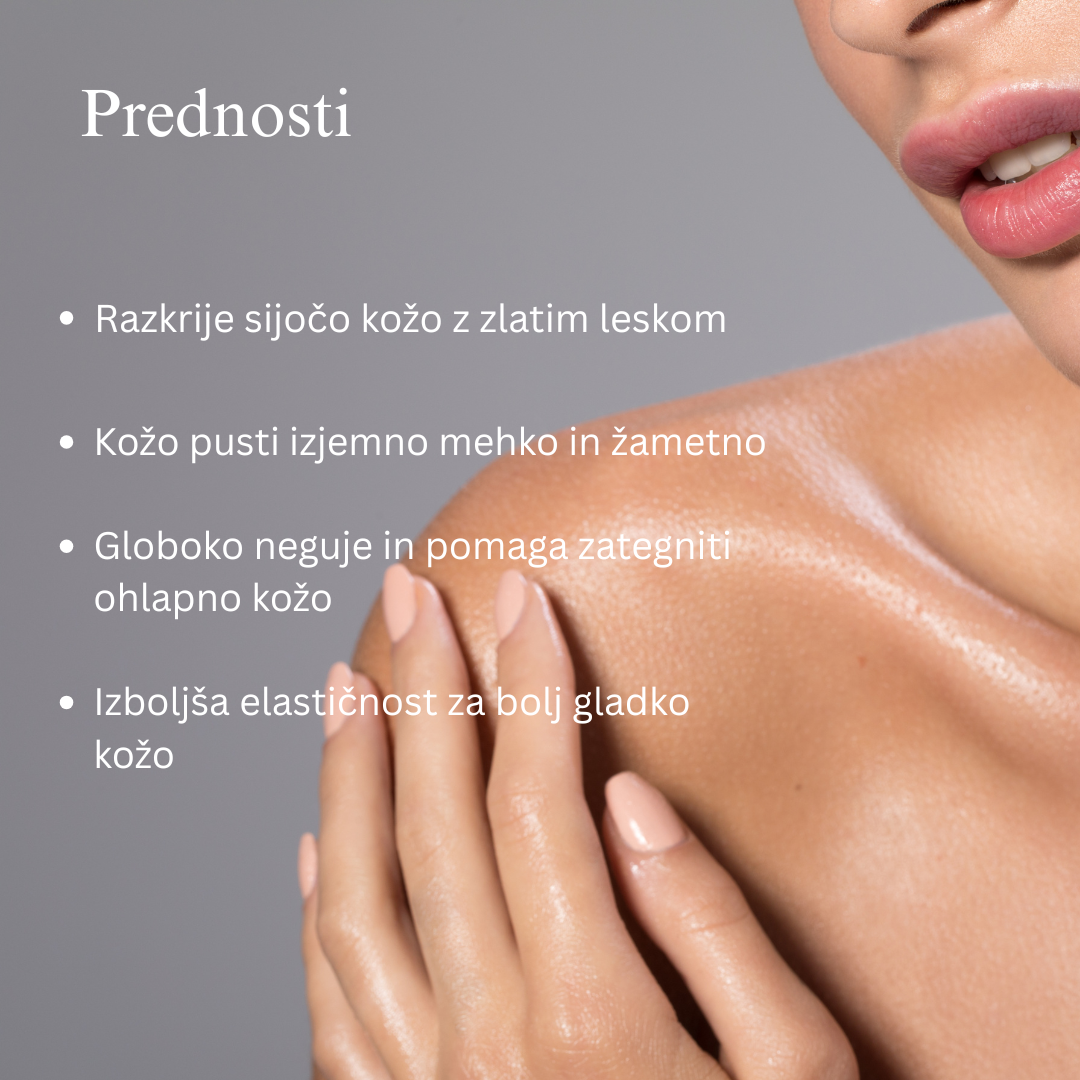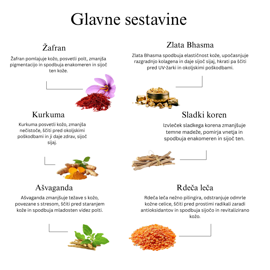 To luksuzno olje za telo, ki združuje 24-karatno zlato Bhasma z močno mešanico rastlinskih izvlečkov, globoko vlaži, izboljša elastičnost kože in spodbuja sijoč in mladosten videz. Na podlagi starodavne modrosti ajurvede to olje združuje pomlajevalne lastnosti ashwagandhe, kurkume in žafrana z modernimi inovacijami za nego kože. Ti dragoceni rastlinski izvlečki delujejo v harmoniji, da kožo osvetlijo, zmanjšajo temne lise in zmanjšajo znake staranja, tako da koža ostane mehka, gladka in revitalizirana. Dodatek olja sladkih mandljevih semen, olja grozdnih pešk in sezamovega olja zagotavlja optimalno prehrano, medtem ko edinstvena infuzija Gold Bhasma pomaga izboljšati naravno svetlost kože..
