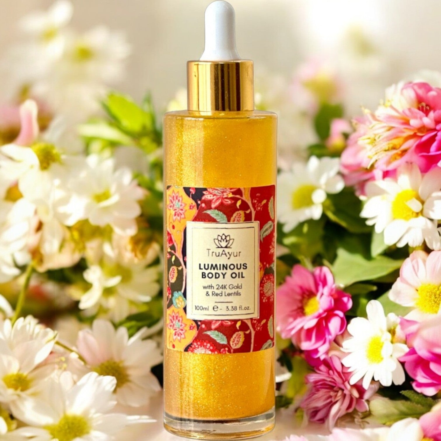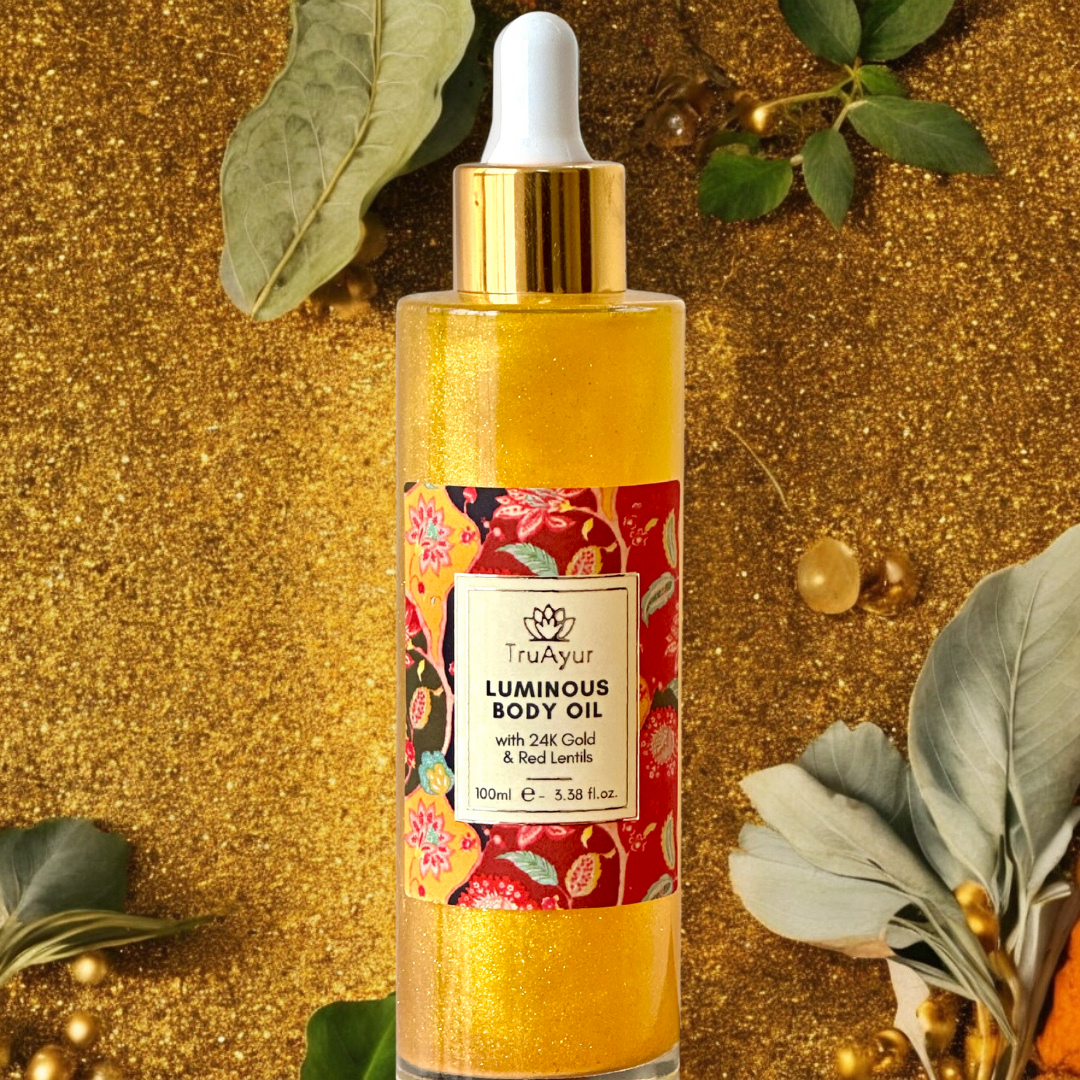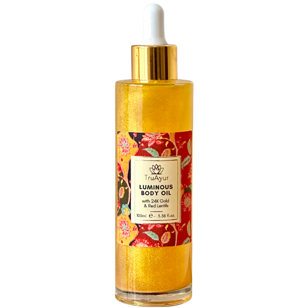 To luksuzno olje za telo, ki združuje 24-karatno zlato Bhasma z močno mešanico rastlinskih izvlečkov, globoko vlaži, izboljša elastičnost kože in spodbuja sijoč in mladosten videz. Na podlagi starodavne modrosti ajurvede to olje združuje pomlajevalne lastnosti ashwagandhe, kurkume in žafrana z modernimi inovacijami za nego kože. Ti dragoceni rastlinski izvlečki delujejo v harmoniji, da kožo osvetlijo, zmanjšajo temne lise in zmanjšajo znake staranja, tako da koža ostane mehka, gladka in revitalizirana. Dodatek olja sladkih mandljevih semen, olja grozdnih pešk in sezamovega olja zagotavlja optimalno prehrano, medtem ko edinstvena infuzija Gold Bhasma pomaga izboljšati naravno svetlost kože..