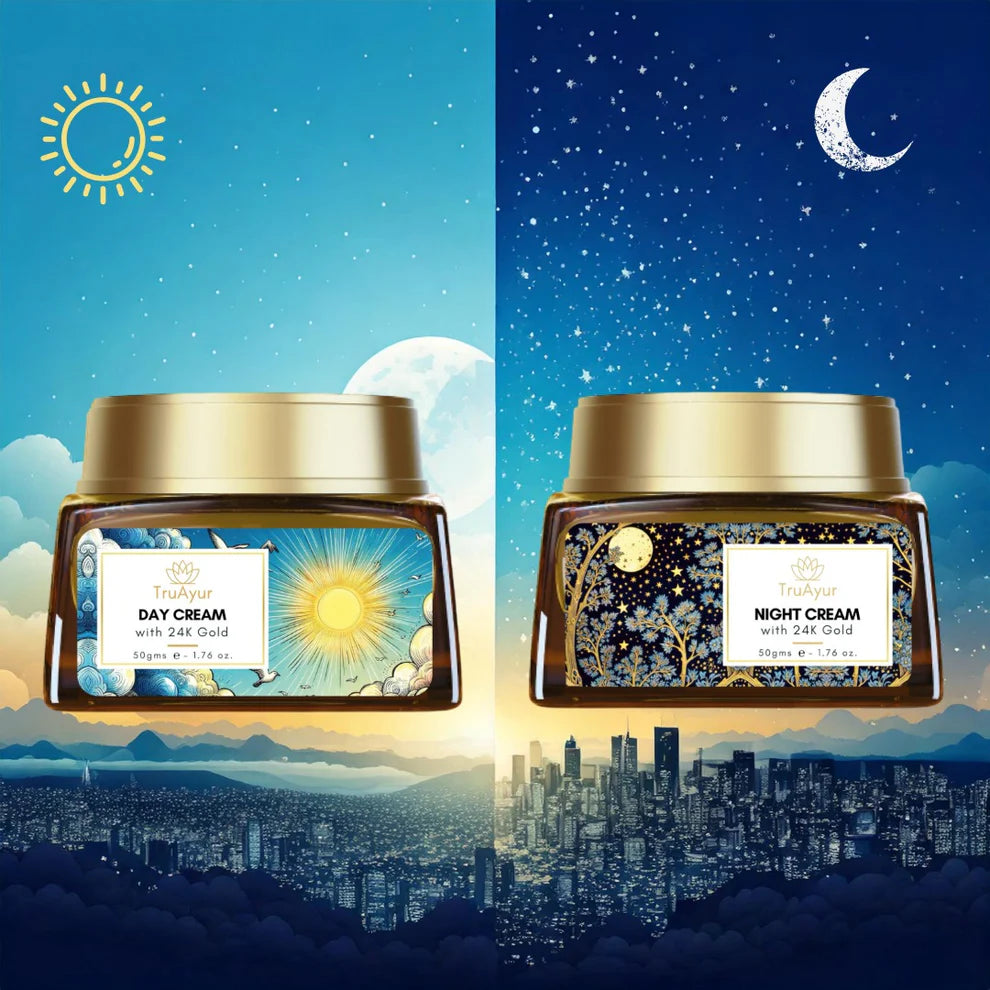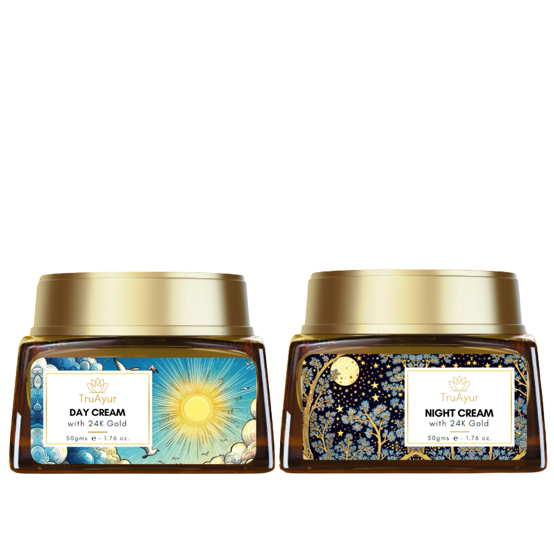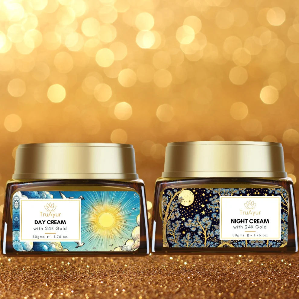 Odkrijte skrivnost sijoče in mlade kože s popolno kombinacijo ajurvede in znanosti v naši kombinaciji dnevnih in nočnih krem. Ta razkošni duo, obogaten z več kot 15 močnimi ajurvedskimi rastlinskimi izvlečki in preobrazbeno močjo Bhasme v 24-karatnem zlatu, je vaša 24-urna rešitev za negovano, sijočo in pomlajeno kožo..