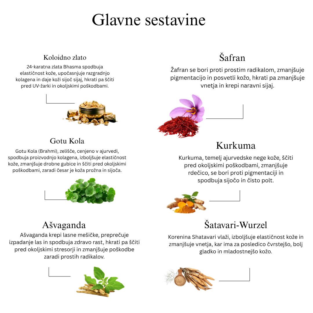 Nočna krema 24 karatov zlata deluje čudežno med spanjem, globoko neguje in obnovi naravni sijaj vaše kože. Z močnimi ajurvedskimi rastlinskimi izvlečki, kot so ašvaganda, kurkuma in manjistha, v kombinaciji z olji, kot so sladka mandlja, sezam in jojoba, odpravlja drobne gubice, temne madeže in neenakomeren ton. Sestavine, kot so žafran, bakuchi in nagkesar, kožo osvetlijo in jo napnejo, vitamin B3, provitamin B5 in vitamin E pa okrepijo kožno pregrado za bolj poln in zdrav videz.