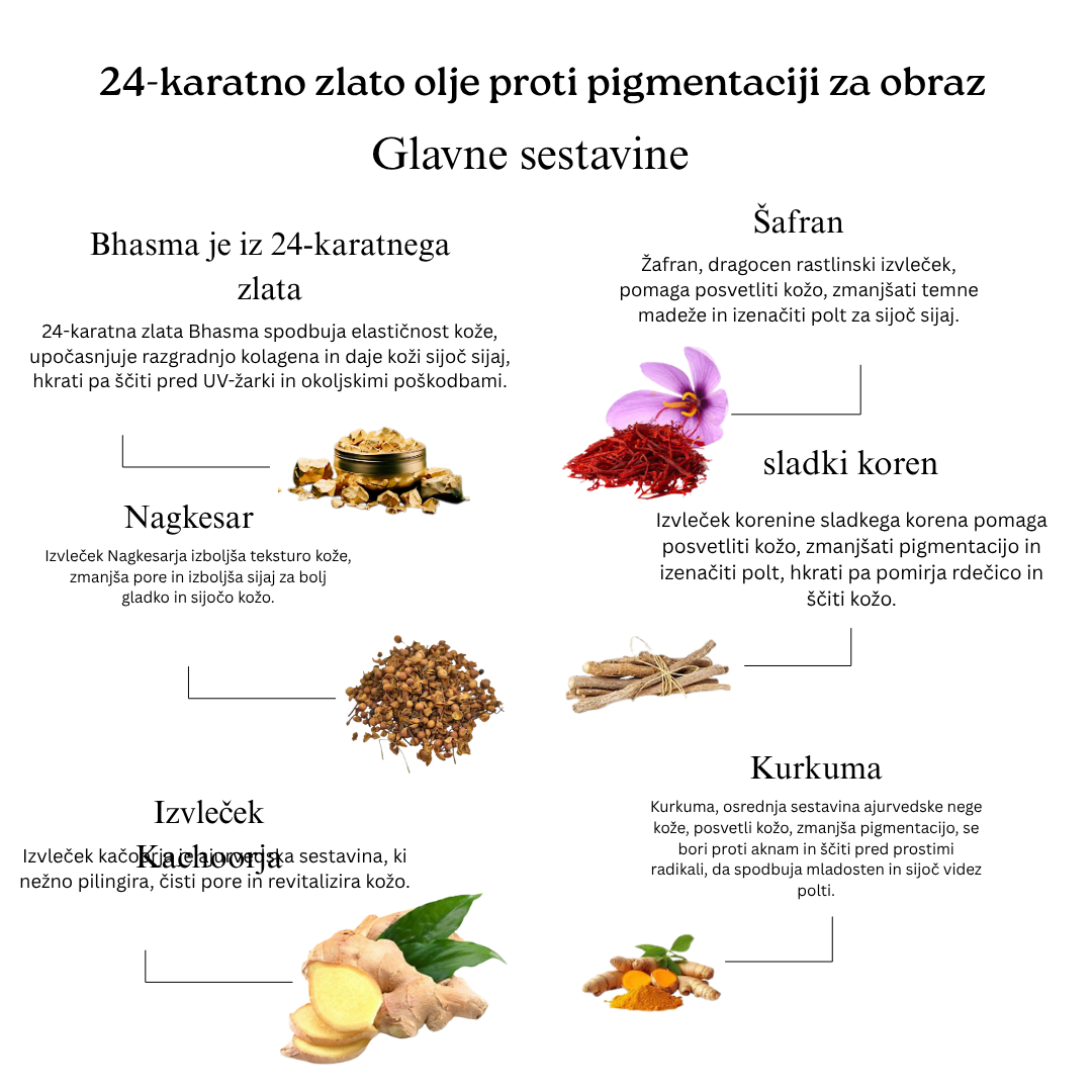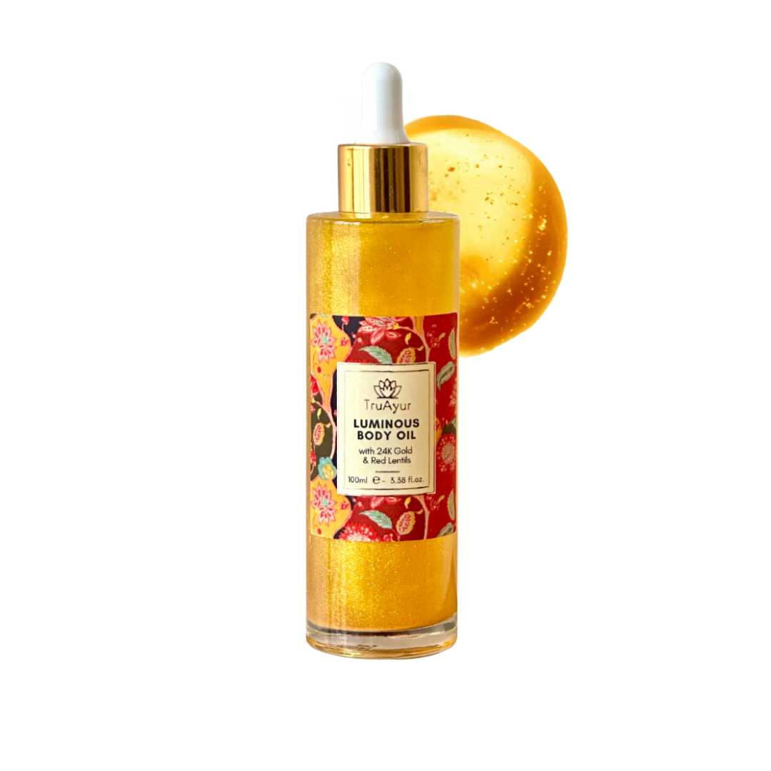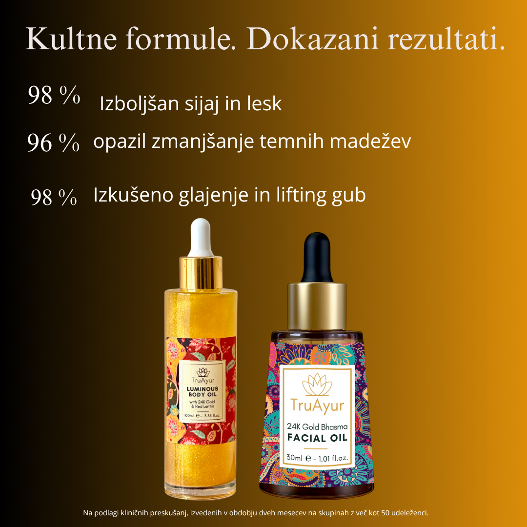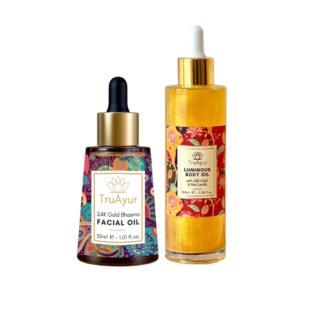 Ta močna kombinacija, ki izhaja iz stoletnih ajurvedskih tradicij, vključuje olje za obraz z 24-karatnim zlatom, lahkotno, a globoko hranljivo eliksir, ki kožo osvetli, izgladi in izboljša njeno elastičnost, ter olje za telo z 24-karatnim zlatom, mešanico, bogato s hranili, ki kožo globoko navlaži, jo napne in ji doda sijoč zlati lesk. S sestavinami, kot so žafran, kurkuma, ašvaganda in rdeče leče, ta duo ne le izboljša sijaj, ampak tudi okrepi kožno pregrado, zmanjša znake staranja in izenači ton kože, kar zagotavlja sijoč in mladosten videz od obraza do telesa.