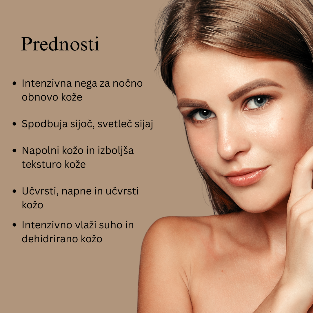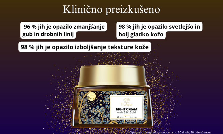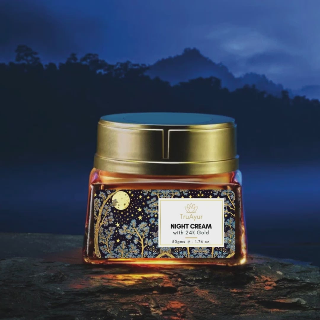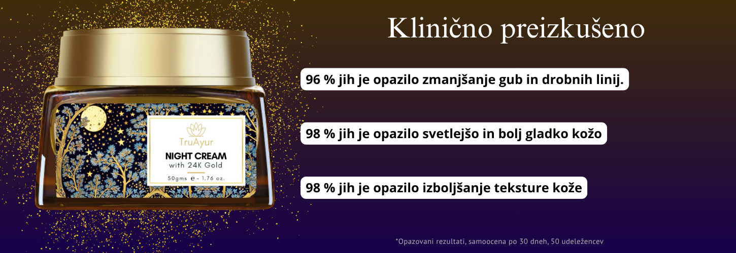 Nočna krema z 24-karatnim zlatom je vrhunska mešanica starodavne ajurvedske modrosti in sodobnih inovacij na področju nege kože, obogatena z Bhasmo iz 24-karatnega zlata in močno mešanico več kot 15 rastlinskih zakladov. Namenjena je delovanju ponoči, ko intenzivno neguje, obnavlja in revitalizira kožo, se bori proti drobnim gubam, temnim madežem in neenakomernemu tenju, hkrati pa povečuje elastičnost in čvrstost kože.