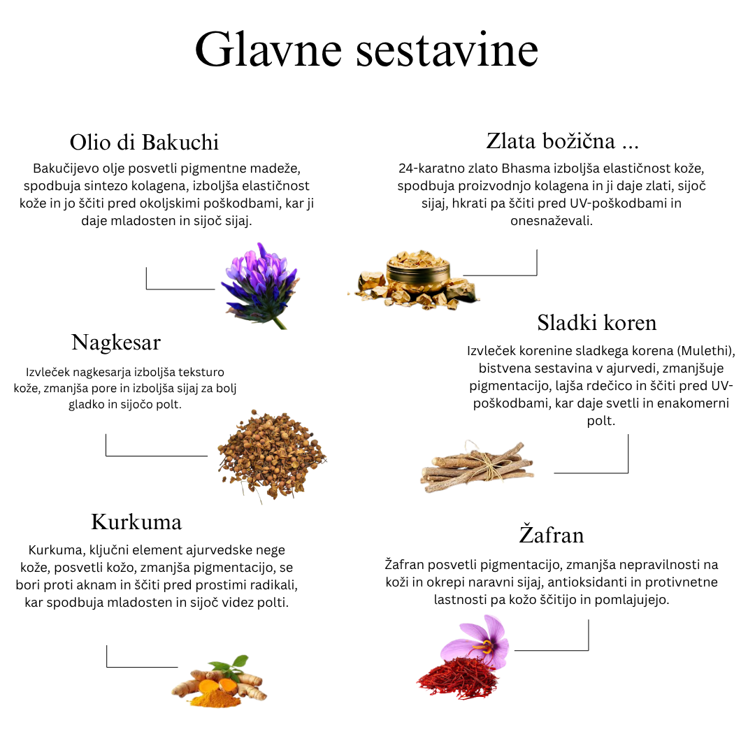 Ta krema, ki temelji na dokazanem znanju ajurvede o ravnovesju in pomlajevanju, združuje dragocene zelišča, kot so ašvaganda, bakuchi, kurkuma in manjistha, z olji, kot so sladka mandlja, sezam in jojoba. Te sestavine delujejo v harmoniji, da razstrupljajo, zaščitijo in obnovijo kožo ter izboljšajo njeno naravno sijajnost in odpornost..