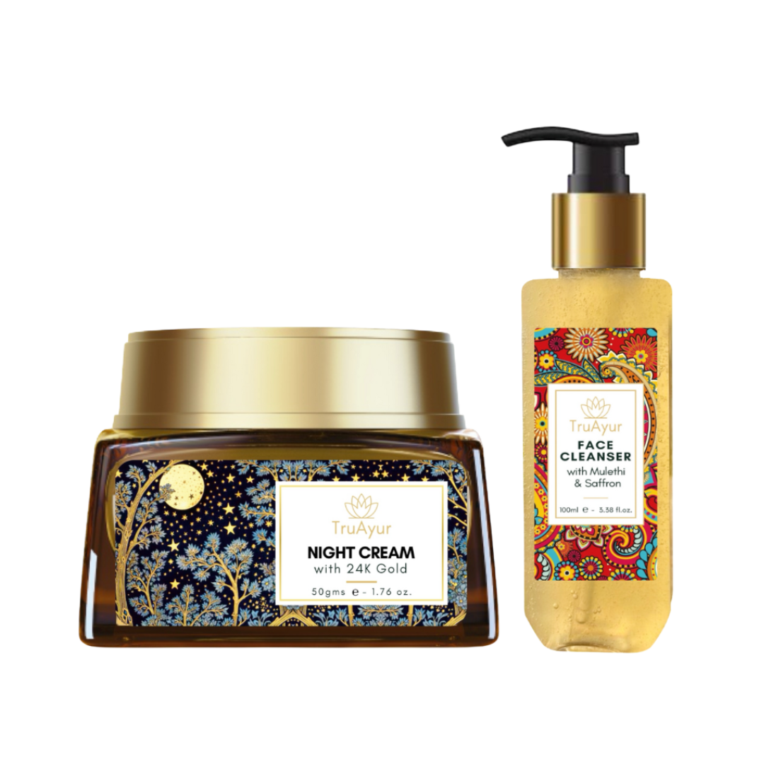 Navdihnjen z 5000 let staro modrostjo ajurvede, nočni ritual Saffron Glow združuje najdragocenejše rastlinske sestavine narave z modernimi inovacijami na področju nege kože. Čistilo za obraz kožo očisti in osvetli s sestavinami, kot so sladki koren, ašvaganda in žafran, tako da je koža osvežena in pripravljena na nočno obnovo. Nato uporabite 24-karatno zlato nočno kremo, obogateno z 24-karatnim zlatom Bhasma, kurkumo in Manjistho, ki kožo globoko navlaži, zmanjša pigmentacijo in obnovi elastičnost za sijoč in mladosten ten.