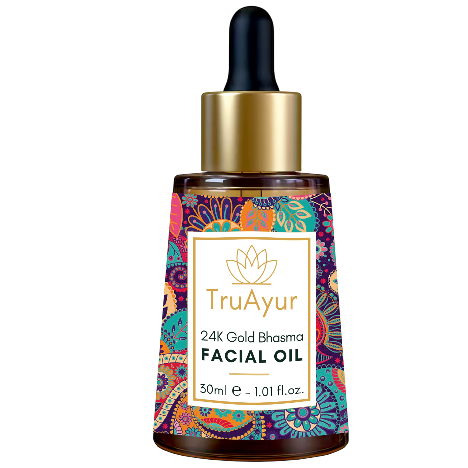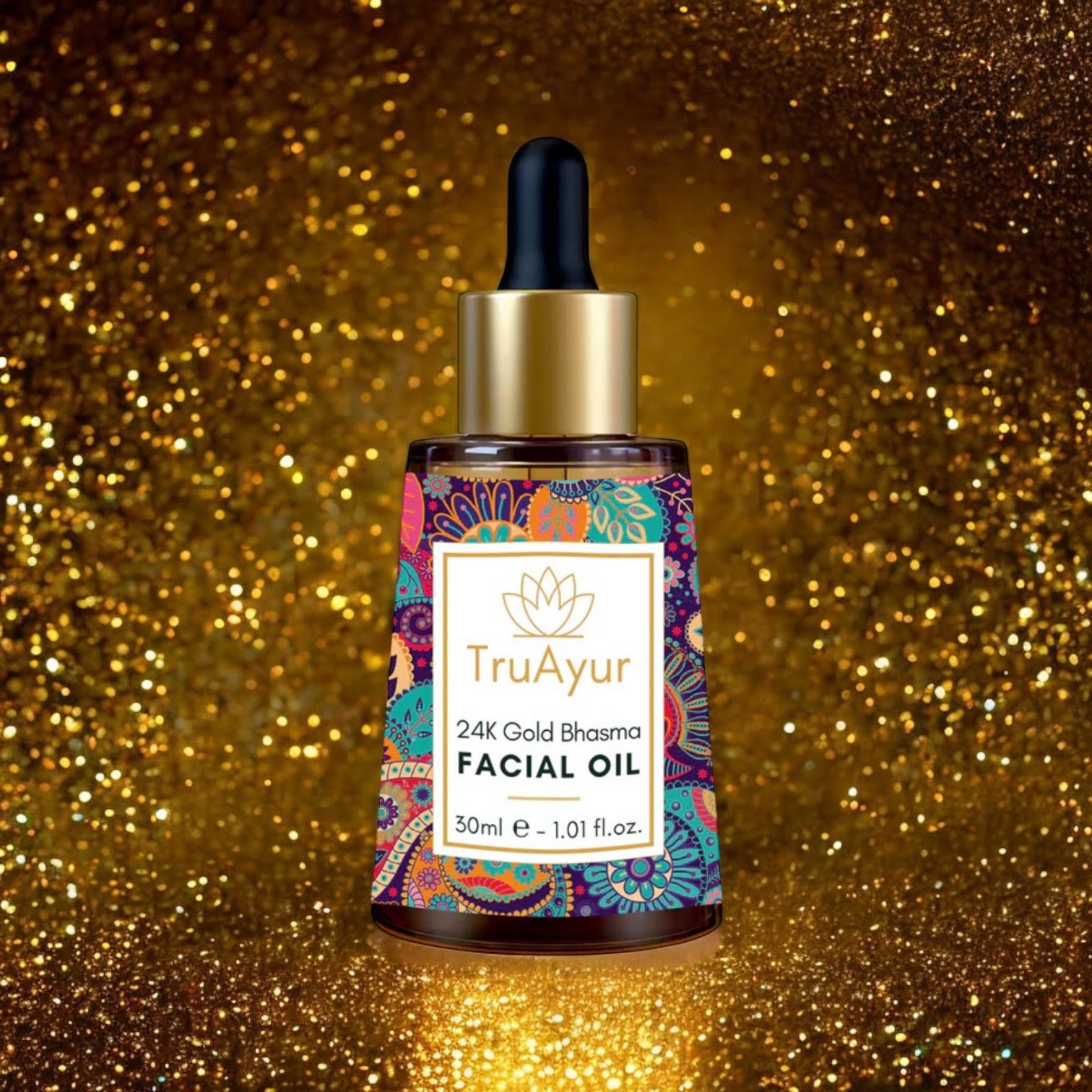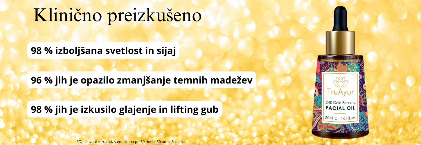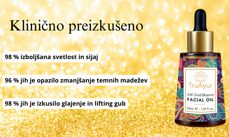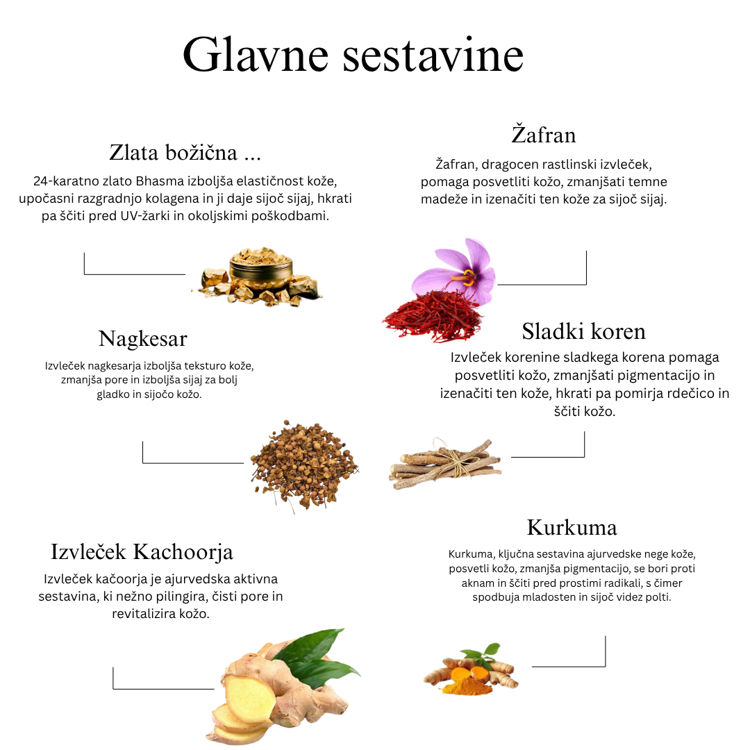 Olje za obraz 24K Gold Bhasma je tradicionalno in edinstveno ajurvedsko serum na osnovi dragocenih zelišč in 24-karatnega zlata, ki pomaga zmanjšati prve znake staranja in posvetliti pigmentacijo. Ta izjemna formula neguje kožo in pomaga izboljšati njeno teksturo. Ayurvedic Radiance Elixir izkorišča moč izjemno močnih zelišč, ki so v zahodnem svetu težko dostopna, na različne načine, da doseže jasen in enakomeren ten ter zlato sijaj. Zahvaljujoč kombinaciji znanja moderne znanosti in 5000 let starih ajurvedskih receptur boste občutili revolucionarno moč te formule za zlato preobrazbo vaše kože.